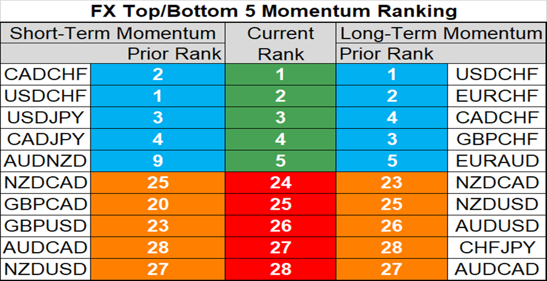 The image with this post is a short-term/ long-term momentum rank for the top 5 and bottom 5 of the 28 primary pairs we follow. We utilize a statistically-based method of calculating momentum that is robust enough to adapt to fast or slow moving markets, while being normalized so the outputs can be directly comparable and sorted from one pair/cross to another.