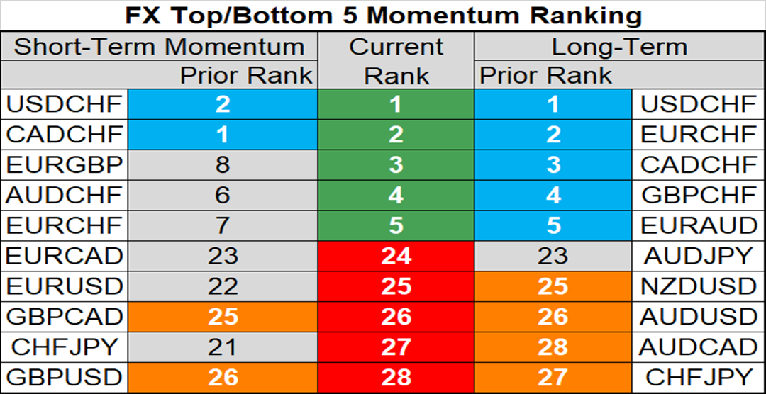 The image with this post is a short-term/ long-term momentum rank for the top 5 and bottom 5 of the 28 primary pairs we follow. We utilize a statistically-based method of calculating momentum that is robust enough to adapt to fast or slow moving markets, while being normalized so the outputs can be directly comparable and sorted from one pair/cross to another.