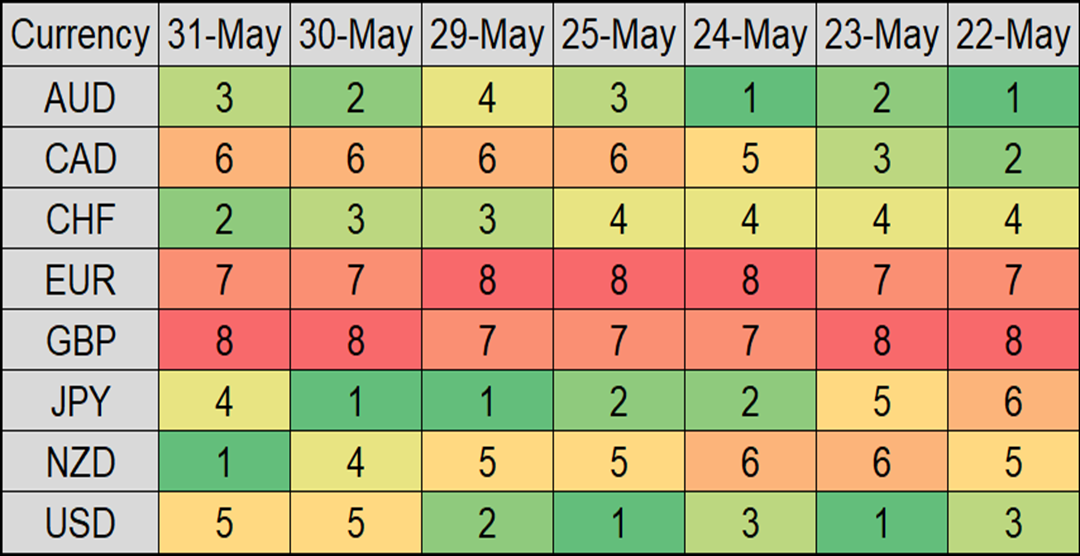 The image with this post ranks short-term momentum for the majors. The strongest momentum is ranked "1" in dark green and "8" is the weakest or most negative. This gives you a visual representation of strength and weakness to construct trades with corresponding pairs and crosses that represent buying strength and selling weakness. The most opportunistic trades tend to be when there is a shift in trend moving toward the top or bottom of the momentum ranks.