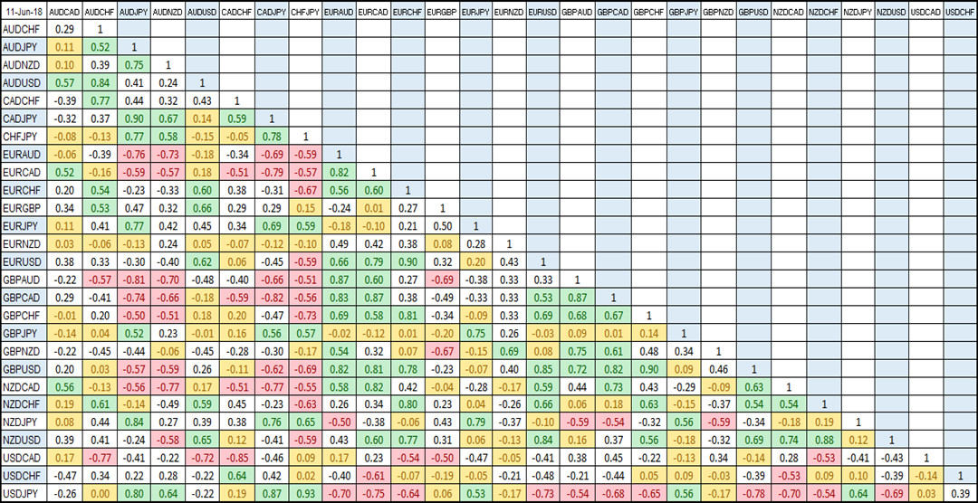 The image with this post is a 30-day correlation matrix. Several pairs have recently been highly correlated and inversely correlated. High correlations are highlighted in green. High inverse correlations are highlighted in red. Lack of correlation is highlighted in yellow.