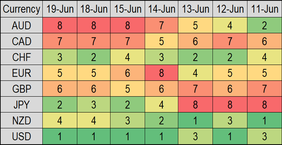 Yesterday the image shared was of the majors long-term momentum ranking. Today, the image with this post illustrates short-term momentum for the majors. The strongest momentum is ranked "1" in dark green and "8" is the weakest or most negative. This gives you a visual representation of strength and weakness to construct trades with corresponding pairs and crosses that represent buying strength and selling weakness. The most opportunistic trades tend to be when there is a shift in trend moving toward the top or bottom of the momentum ranking.