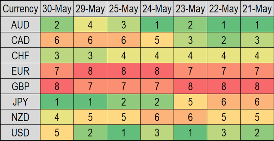 Last week we mentioned JPY was notably gaining strength the short-term momentum rank shifted. Today we note that USD has shifted significantly from strength to weakness (See image).